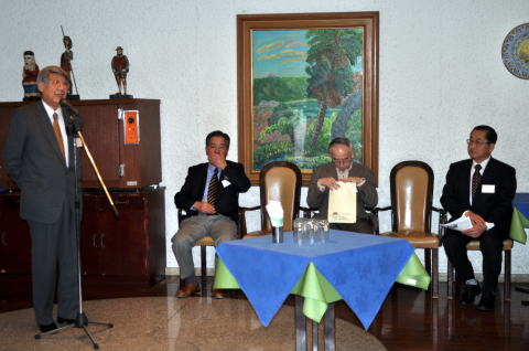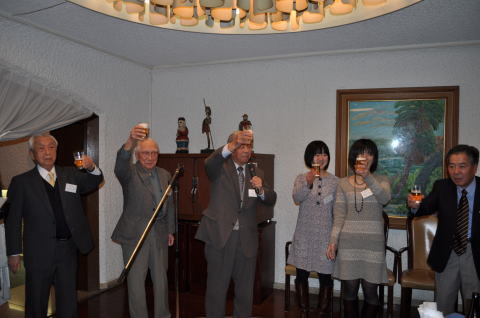 テーマは「札幌モエレ沼にイサムノグチの公園」です。講演が進むに連れ「札幌モエレ沼公園」と「イサムノグチ」がとても身近なものと感じられるようになりました。 松岡拓公雄さん(写真右→) 講演が終わると、ここでいよいよ乾杯の時間に。出席者全員がグラスを片手に、一中44期の賀川文男さん、伊藤勲さん、杉森英夫さん、そして南56期の伊勢谷未羽さん、林美穂さんの音頭で乾杯! |