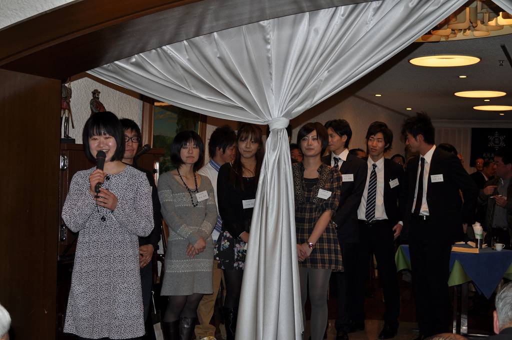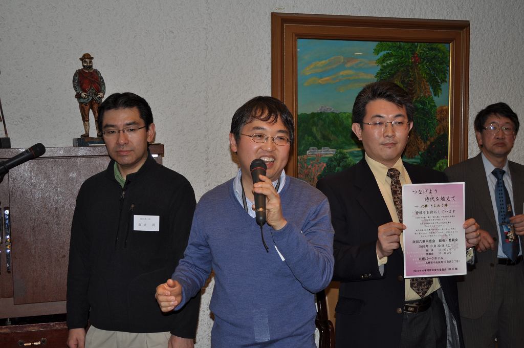 フレッシュな学生諸君へのインタビュー。 南55期松谷俊介さん、橋本詩織さん、後藤直哉さん、南56期伊勢谷未羽さん、林美穂さん、吉田一喜さん、島谷紘文さんが初々しくコメントしてくれました。 会も終盤に近づき、今年の総会懇親会の実行委員会(南26、36,46期)を代表し前田圭一さん(南26期)が挨拶した後、実行委員会皆さんのリードで札幌南高校歌を出席者全員で斉唱しました。(写真下) |